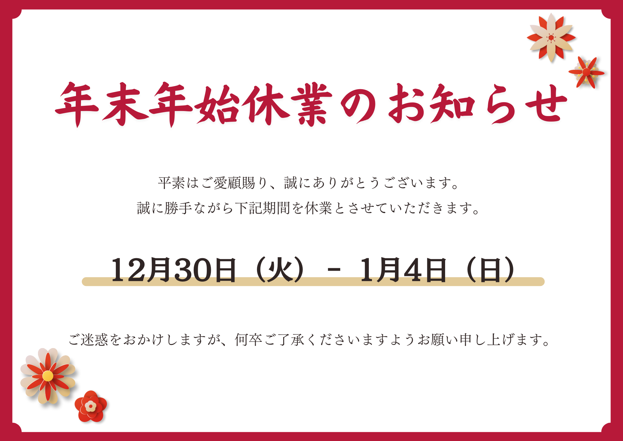 ・年末年始休業期間:2024年12月30日(火)~2025年1月4日(日)